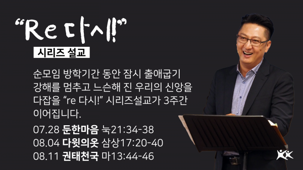 순모임 방학기간 동안 잠시 출애굽기 강해를 멈추고 느슨해 진 우리의 신앙을 다잡을 "re 다시!" 시리즈설교가 3주간 이어집니다.