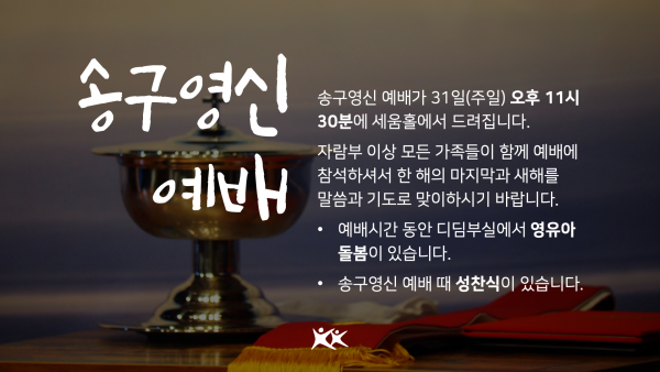 송구영신 예배가 31일(주일) 오후 11시 30분에 세움홀에서 드려집니다.