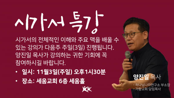 시가서의 전체적인 이해와 주요 맥을 배울 수 있는 강의가 다음주 주일(3일) 진행됩니다. 양진일 목사가 강의하는 귀한 기회에 꼭 참여하시길 바랍니다.